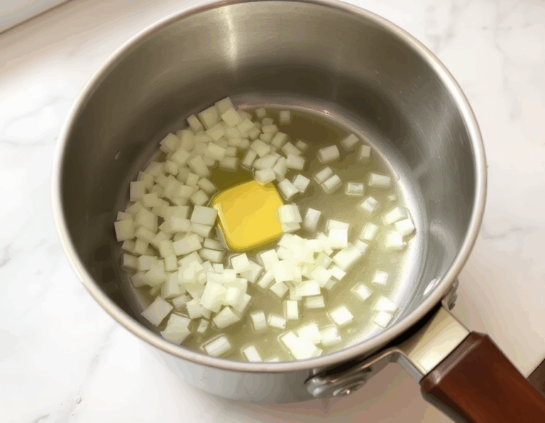 1. Melt butter in a pot over medium heat and sauté chopped onions until they start to become translucent, which should take about 3 minutes.