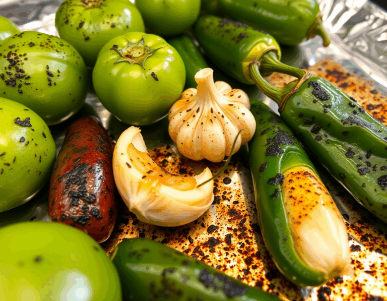 - Preheat your oven to broil. Arrange tomatillos, serrano peppers, jalapeño peppers, and an unpeeled garlic clove on a foil-lined baking sheet. Roast them until they are blackened all over, turning them after about 5 minutes.