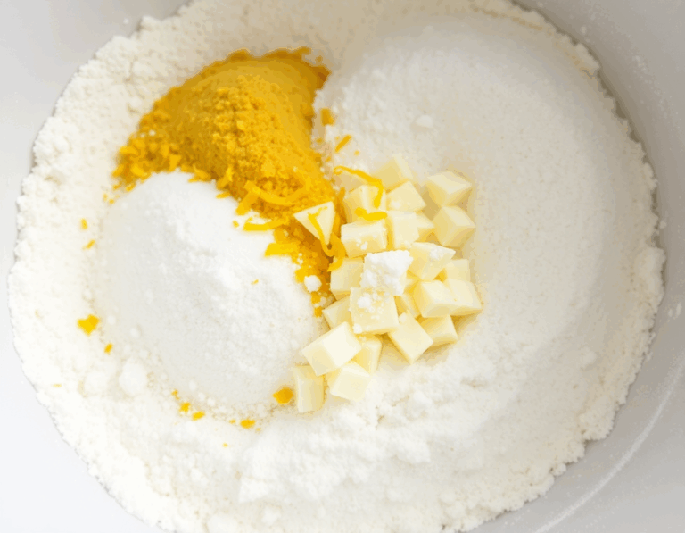 - Combine the flour, sugar, lemon zest, baking powder, and salt in a large bowl. Grate the frozen butter using the large holes of a box grater, then mix it into the flour mixture until it resembles pea-sized crumbs. Freeze the bowl while preparing other ingredients.